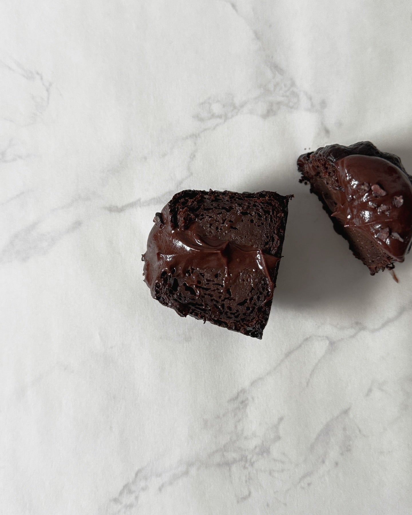 valrhona cocoa canelé, baileys & peppermint oil infused valrhona 70% guanaja chocolate ganache, cacao nibs