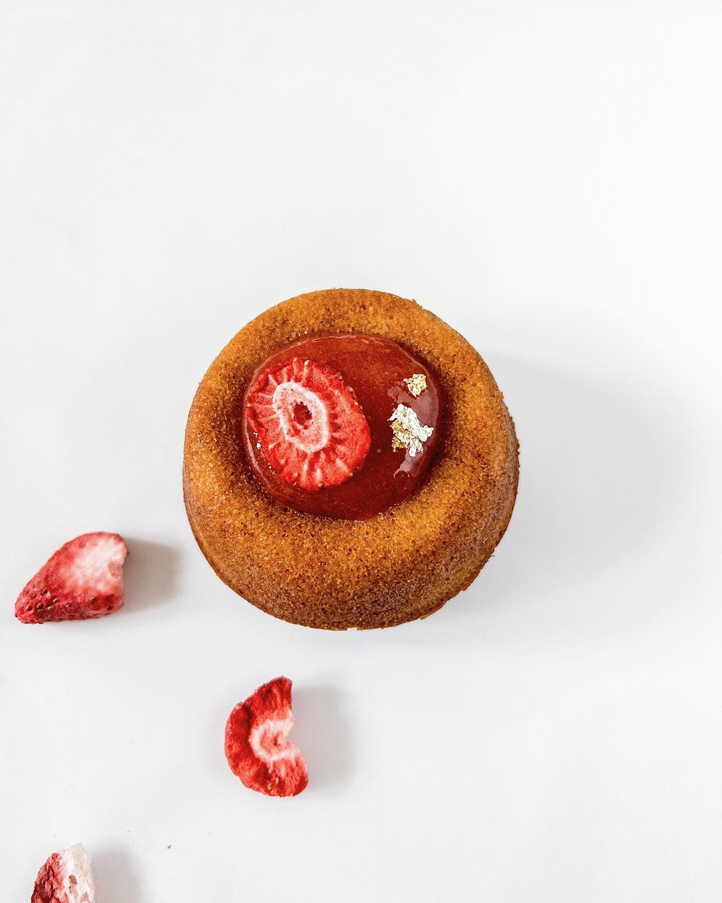 vanilla bean infused brown butter french almond cake, rum & balsamic strawberry compote, freeze dried strawberries